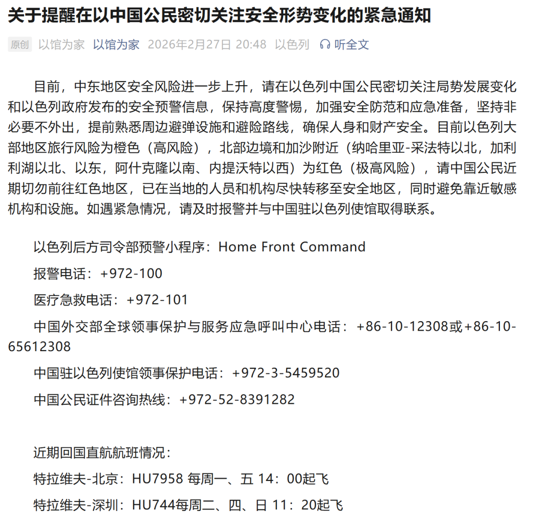 中国驻以色列大使馆发布紧急通知: