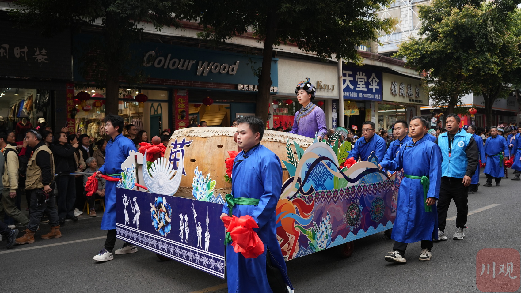 洛表镇队伍融合民俗展演与特色展示,队员们身着“僰人”特色服饰,演绎传统民俗,传递古朴热情。洛亥镇巡游队伍由30余名成员组成秧歌队,身着鲜艳多彩的传统服饰,腰系大红稠,步伐轻盈欢快,扭、摆、走、跳间尽显秧歌的灵动韵律,传递着节日的喜悦。