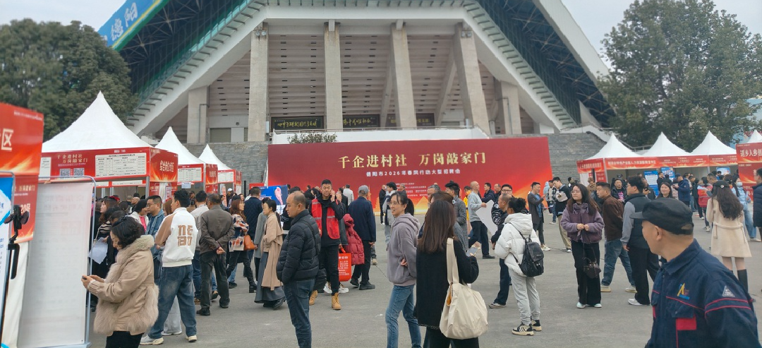 2月27日早晨,德阳市体育公园南广场人声鼎沸、春意融融,“千企进村社·万岗敲家门”德阳市2026年春风行动大型招聘会在此启幕。