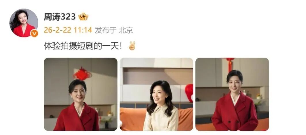 近日,周涛在个人社交平台更新内容,称“体验拍摄短剧的一天”。她在视频中透露,这是她第一次拍短剧,她还表示拍摄很好玩,创作过程中自己的状态很轻松,她希望传达给大家开心的氛围。