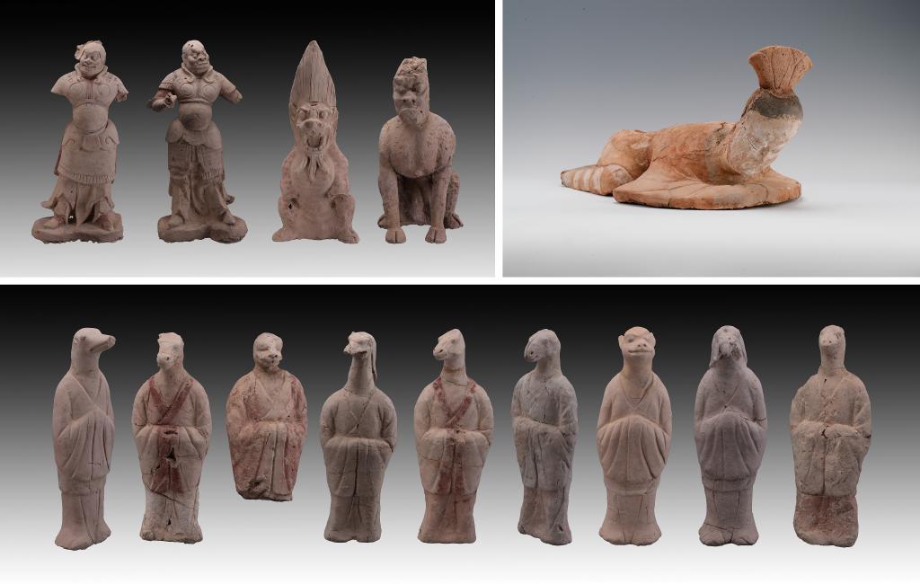 拼版照片:新疆吐鲁番市巴达木东晋唐时期墓群出土的陶俑(资料照片)。新华社 发