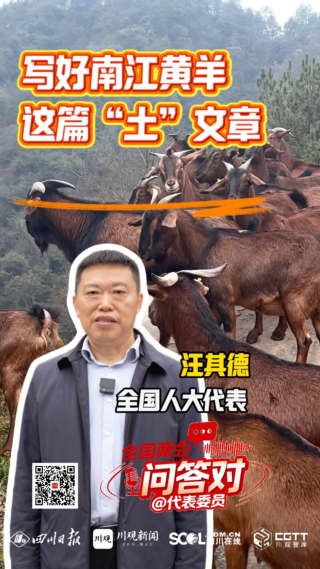 “能不能借助更多的现代化设施让养羊更省力?”“怎么靠养羊赚更多钱?”“我们南江黄羊的品质和产业附加值还能提高吗?”被誉为“亚洲第一羊”的南江黄羊,先后获得欧盟有机食品、国家地理标志保护产品等认证,品牌价值超过40亿元。如今,巴中市南江县的老百姓,都希望南江黄羊这块“金字招牌”更加响亮。而这些关于黄羊的问题,也成为全国人大代表、巴中市南江五郎黄羊养殖专业合作社理事长汪其德一直在努力回答的课题。