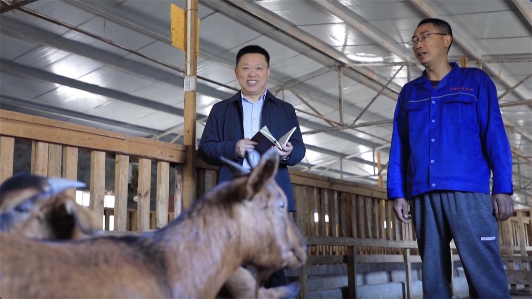汪其德和张四海沟通黄羊养殖技术。