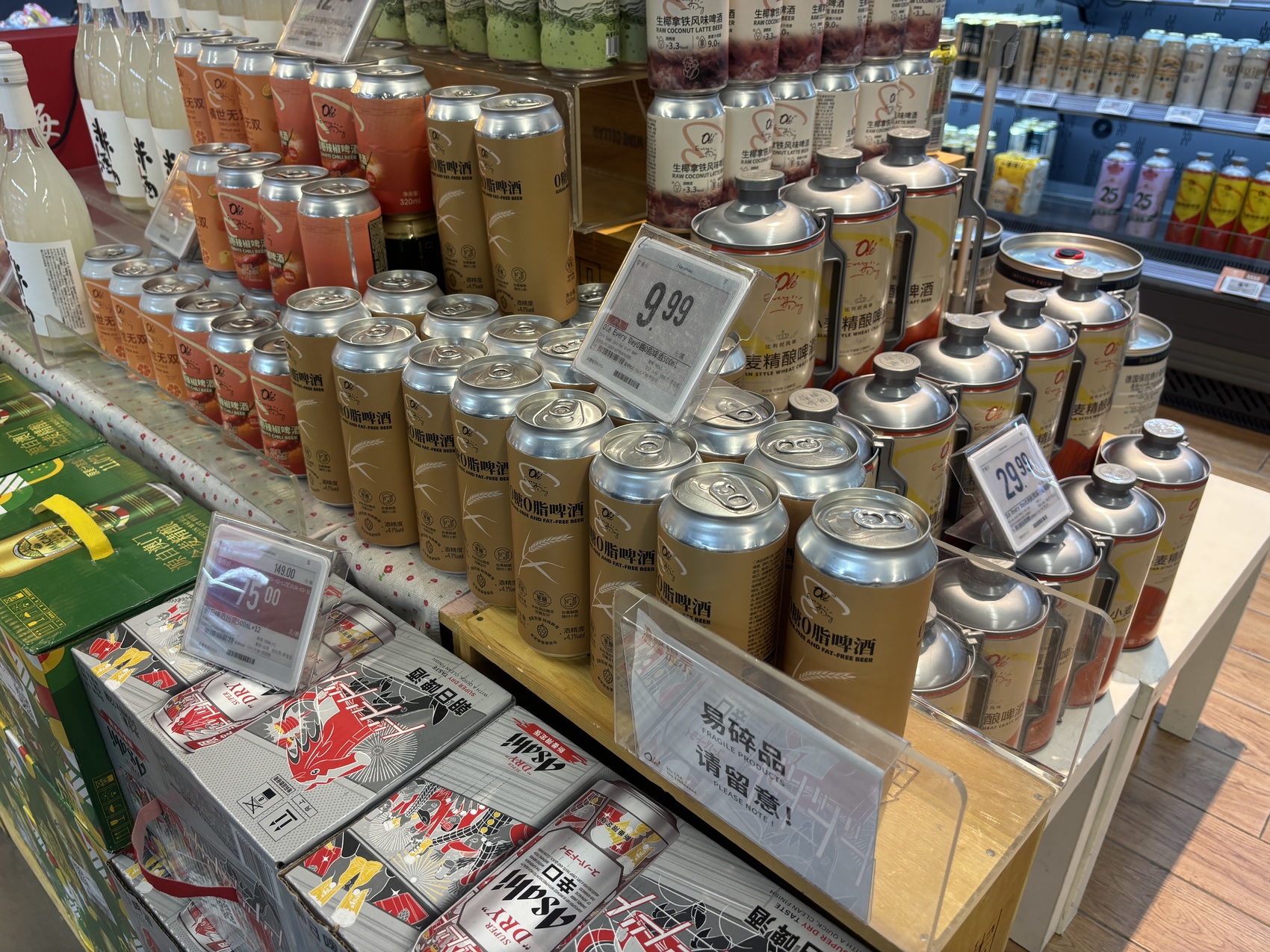 记者看到,在超市酒水区的显眼位置,摆满了印有“永辉定制”字样的精酿啤酒,龙井小麦、蜜瓜艾尔、德式小麦等各种风味一应俱全。