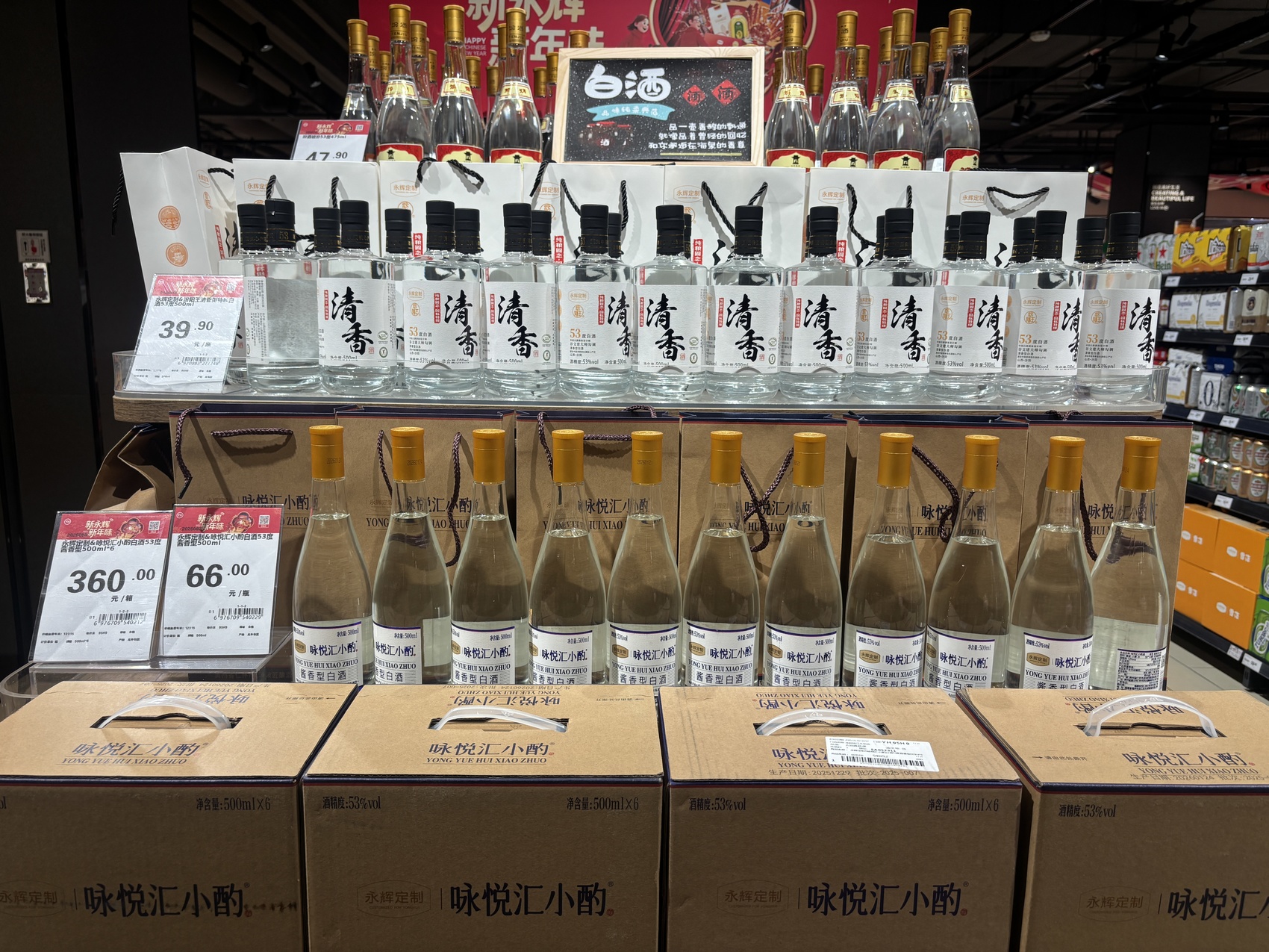 除了精酿啤酒,白酒货架旁的堆头处,整齐摆放着印有“永辉定制”“咏悦汇小酌”字样的光瓶白酒。与汾阳王合作的清香型特级白酒53度500毫升,售价39.9元/瓶;“咏悦汇小酌”酱香型白酒53度,售价66元/瓶,在动辄数百元的酱酒市场中开辟出一条“亲民线”。