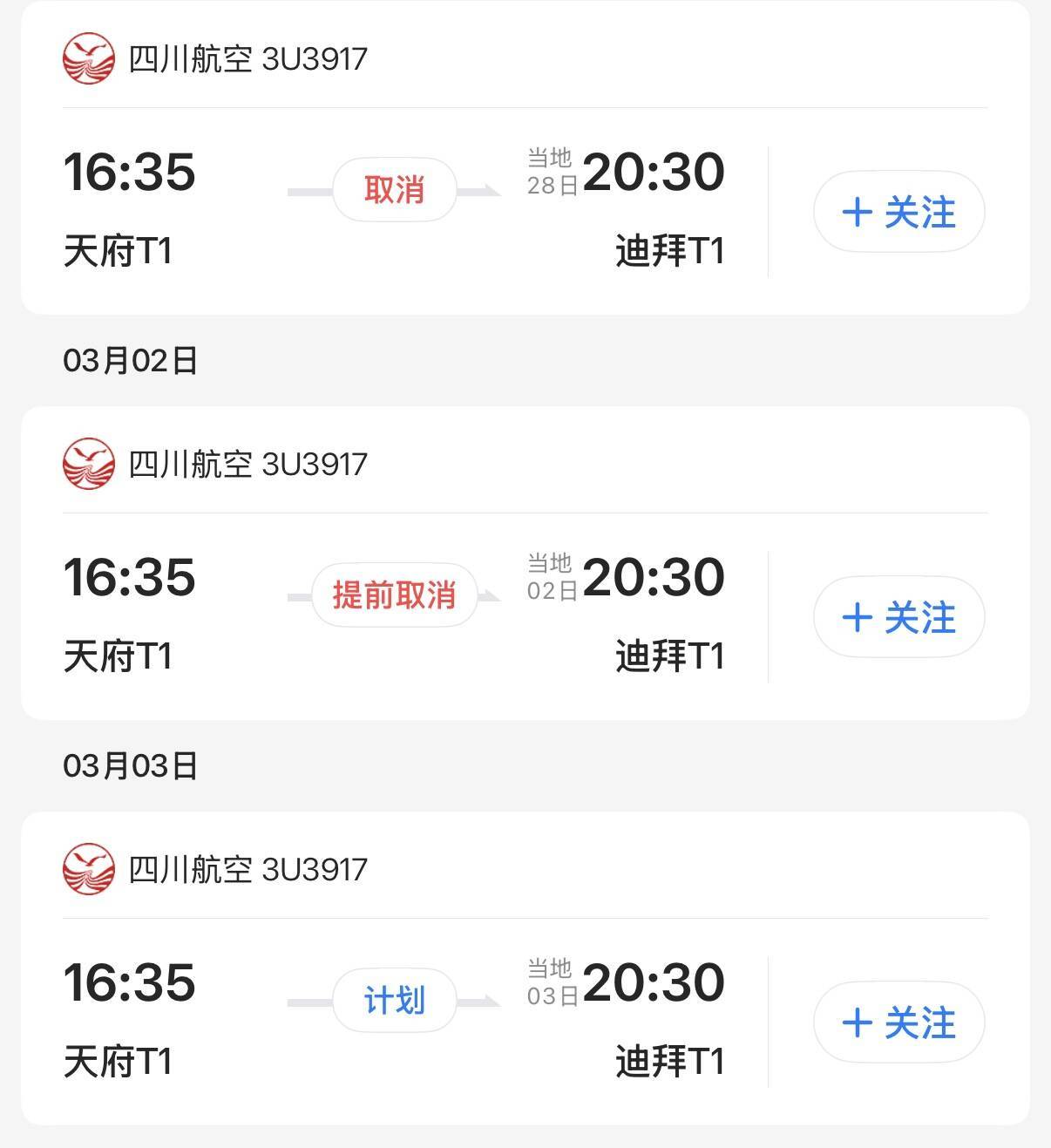 2月28日,由于美国、以色列对伊朗进行了打击行动,中东地区的民航航班受到很大影响。记者查询飞常准发现,由四川航空执飞,28日当天下午从成都直飞迪拜的3U3917航班已经取消。该航班原计划当天16:35起飞,当地时间20:30到达,全程飞行时间7小时55分钟。同时,3月2日该航班也提前取消。据悉,从成都直飞迪拜每日1班,记者查询发现,目前在飞常准、去哪儿等平台上,该航班的3月3日及后续班期仍计划执飞,可购票。