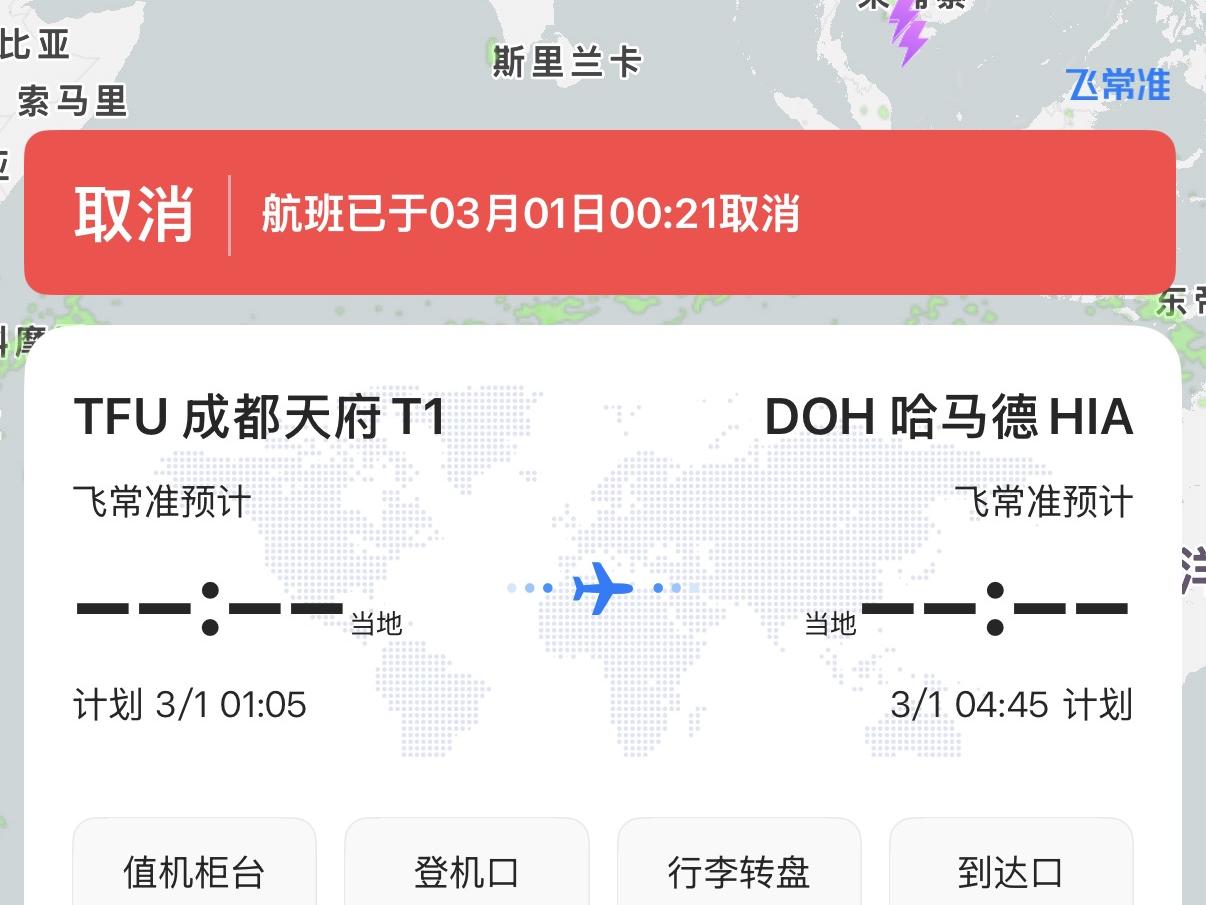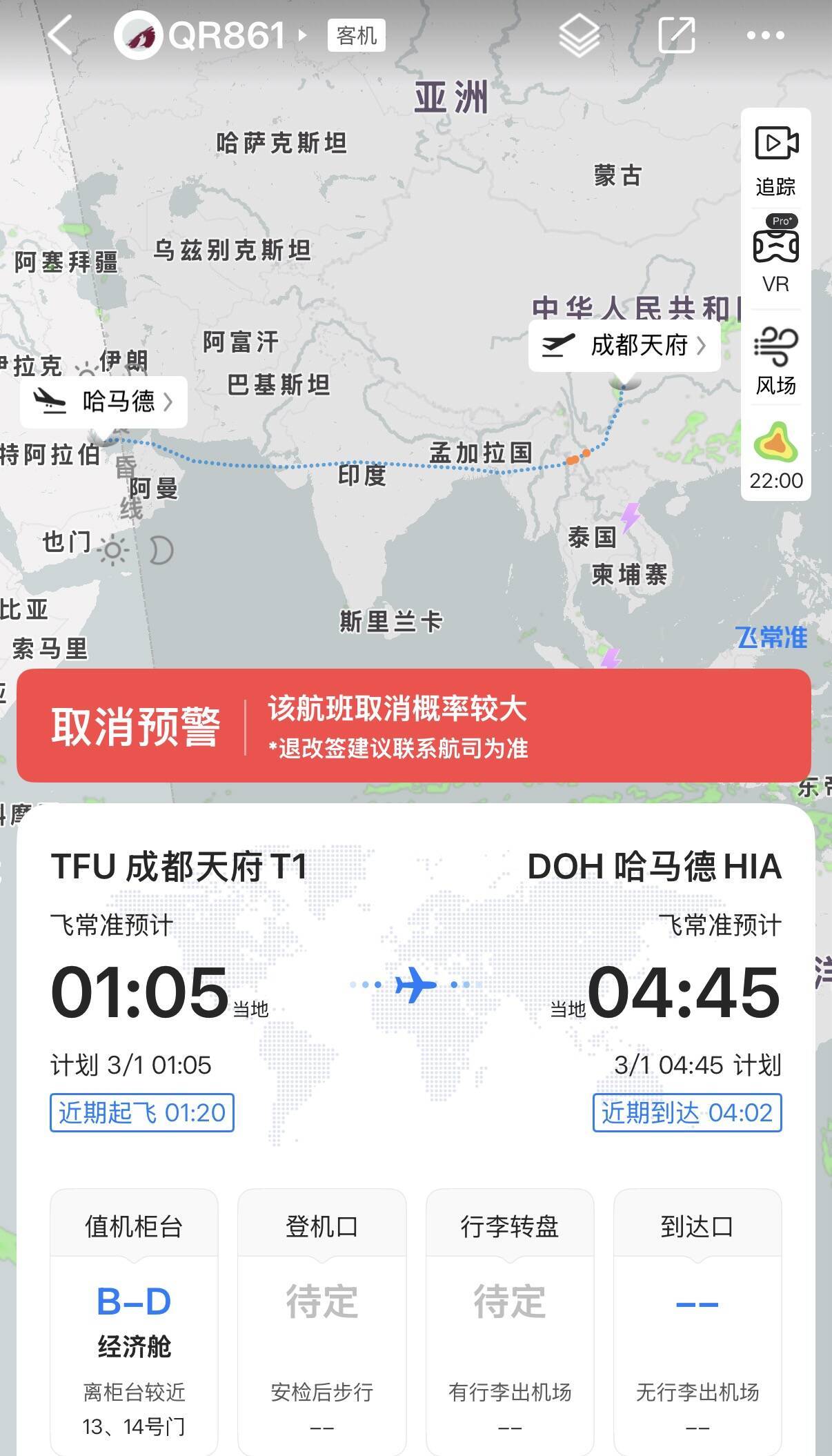 同时,22:20记者查询发现,3月1日由卡塔尔航空执飞,从成都直飞多哈哈马德机场的QR861航班显示取消预警。在1个小时前,该航班还是计划飞行状态,在购票平台仍然能购买机票。该航班每周三、周五、周日执飞,后续QR861航班也能正常购票。