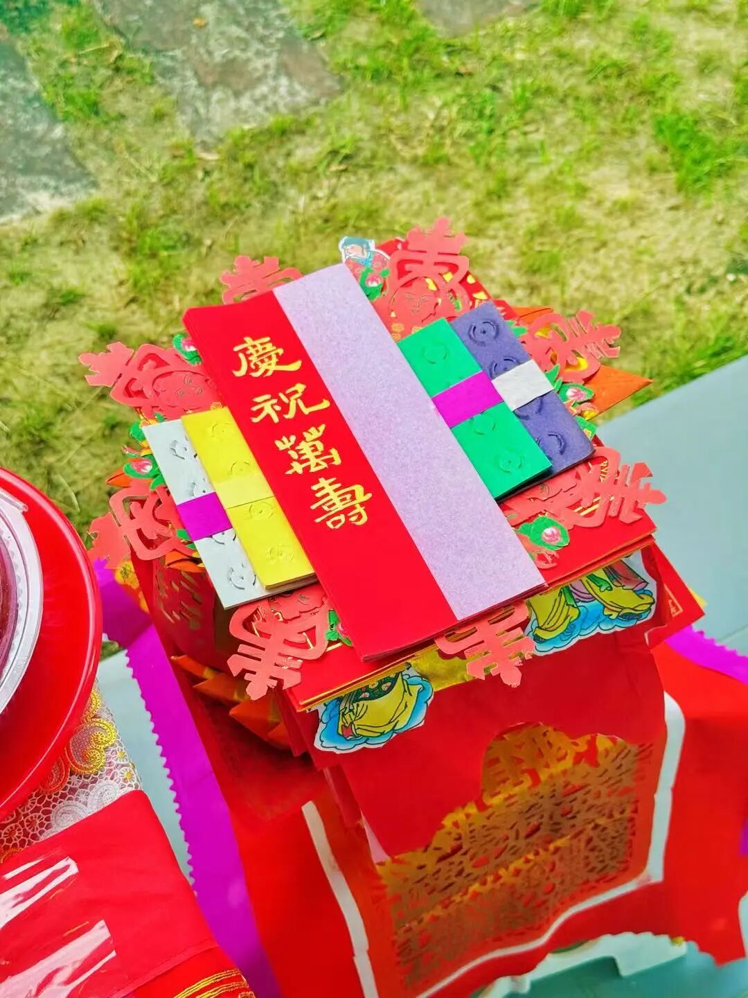 供桌旁,一座两米多高的金元宝塔格外醒目。“我妈妈提前半年就着手准备,用‘天公金’叠成金元宝,还特意收集漂亮的红包封,一点点折成这座塔。”李锦湄说。