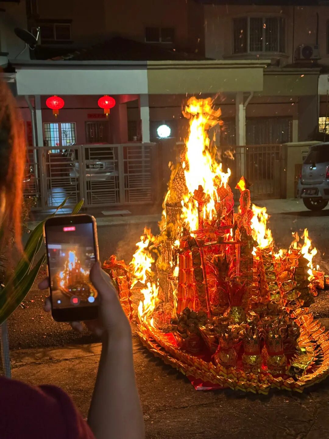 图为在马来西亚吉隆坡,“拜天公”仪式上,寓意吉祥的金元宝塔正在燃烧。(受访者供图)
