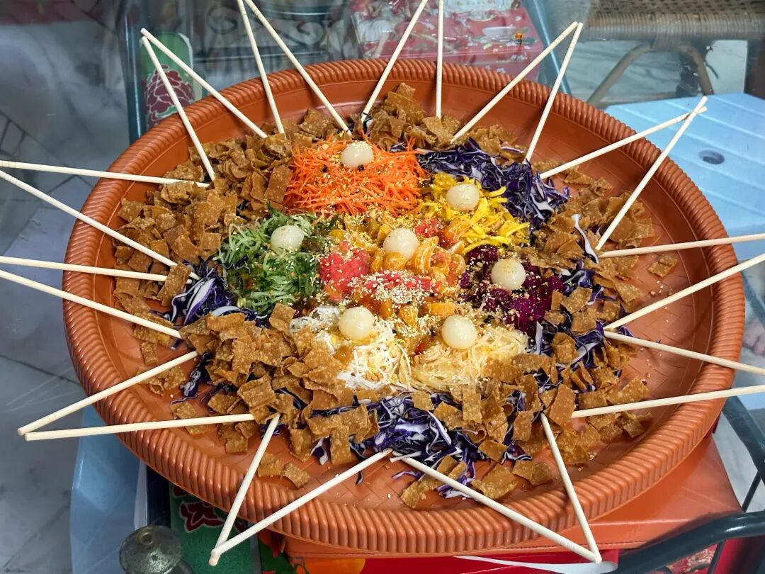 图为在“拜天公”当天,李锦湄一家同吃捞生。(受访者供图)