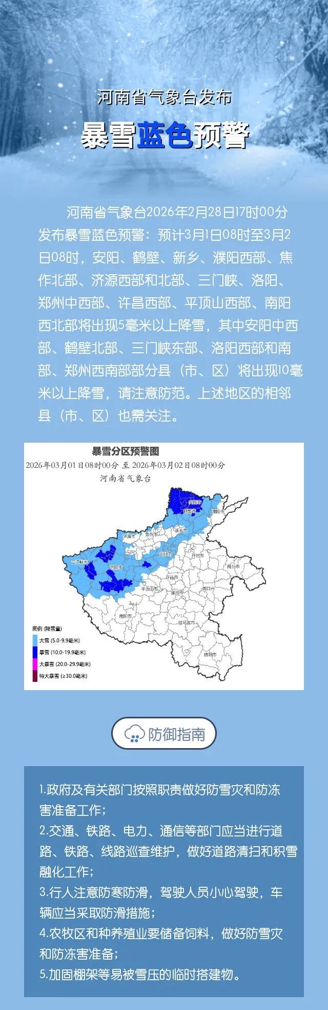 河南省气象台2026年2月28日17时00分发布暴雪蓝色预警:预计3月1日08时至3月2日08时,安阳、鹤壁、新乡、濮阳西部、焦作北部、济源西部和北部、三门峡、洛阳、郑州中西部、许昌西部、平顶山西部、南阳西北部将出现5毫米以上降雪,其中安阳中西部、鹤壁北部、三门峡东部、洛阳西部和南部、郑州西南部部分县(市、区)将出现10毫米以上降雪,请注意防范。上述地区的相邻县(市、区)也需关注。