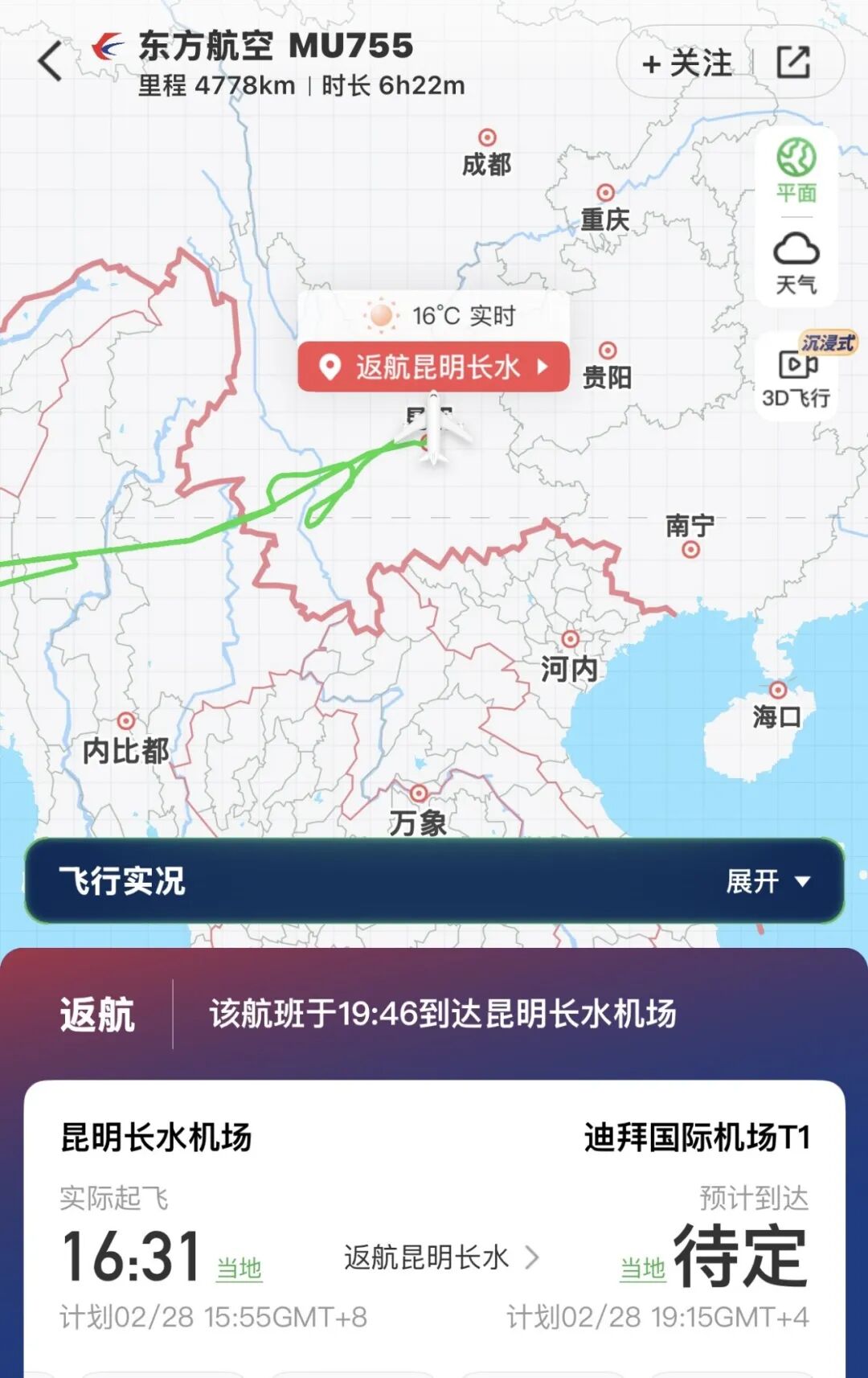 第二个是2月28日昆明飞迪拜的MU755航班,也已经返航到昆明机场。