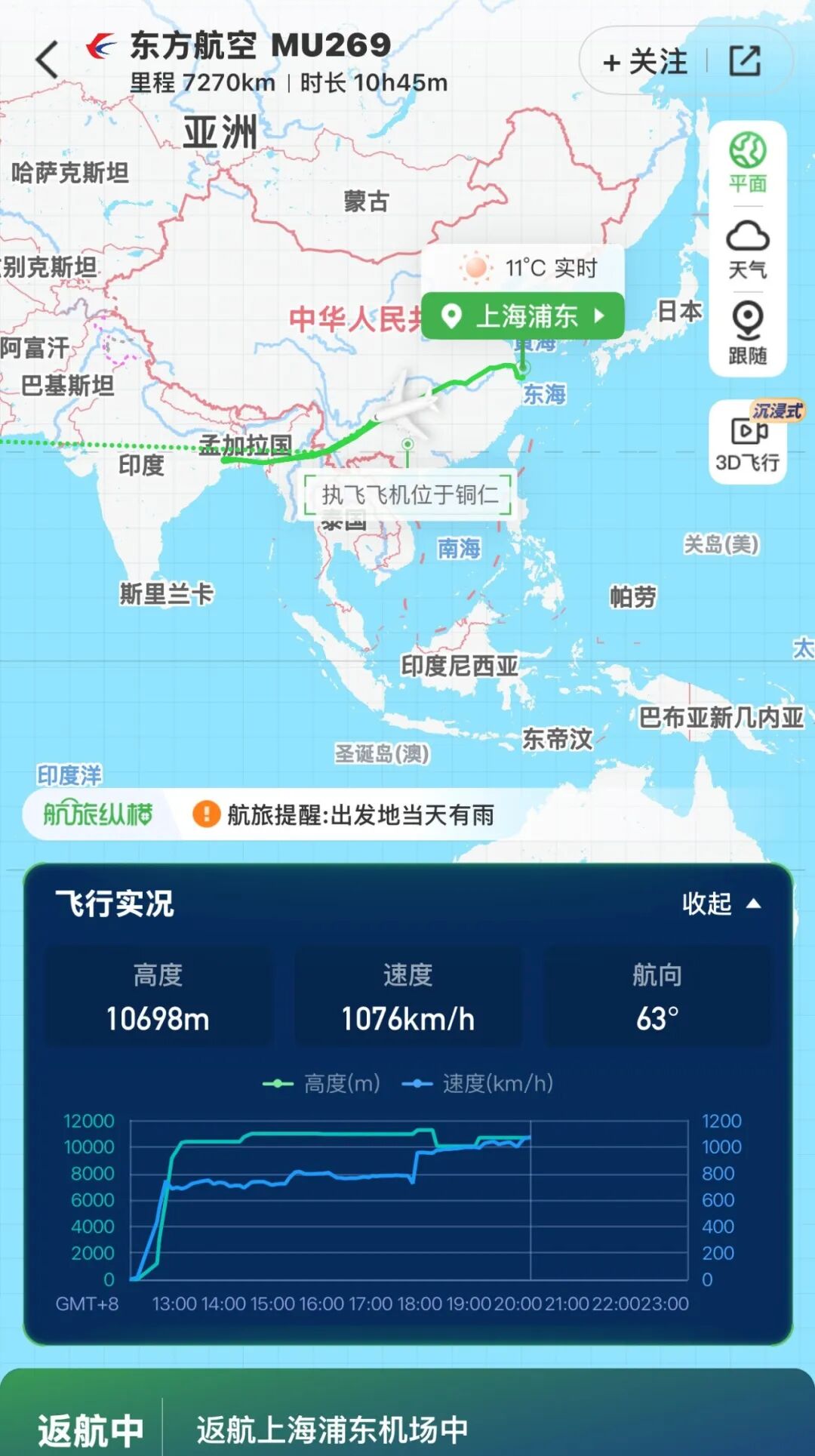 一个是2月28日上海浦东飞利雅得的MU269,中午12点35分从PVG起飞,目前位置在贵州上空,航旅纵横显示返航中。有机上旅客也发了小红书,证实在返航。