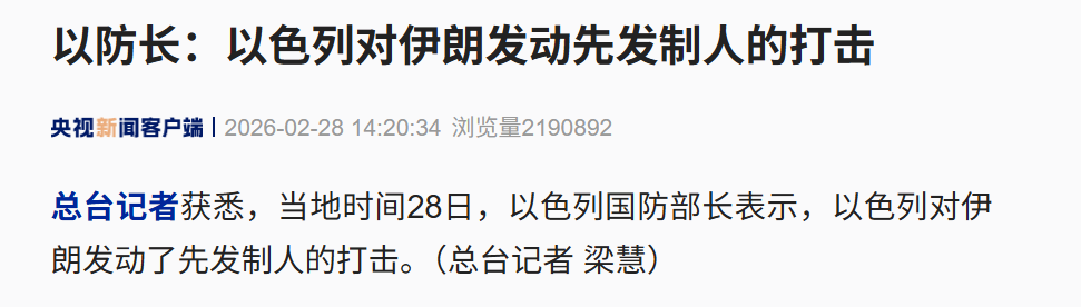据新华社报道,以色列宣布袭击伊朗。总台记者获悉,当地时间28日,以色列国防部长表示,以色列对伊朗发动了先发制人的打击。