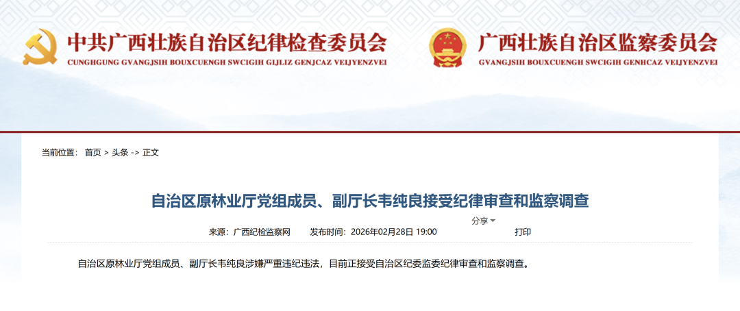 据广西纪检监察网28日消息,自治区原林业厅党组成员、副厅长韦纯良涉嫌严重违纪违法,目前正接受自治区纪委监委纪律审查和监察调查。
