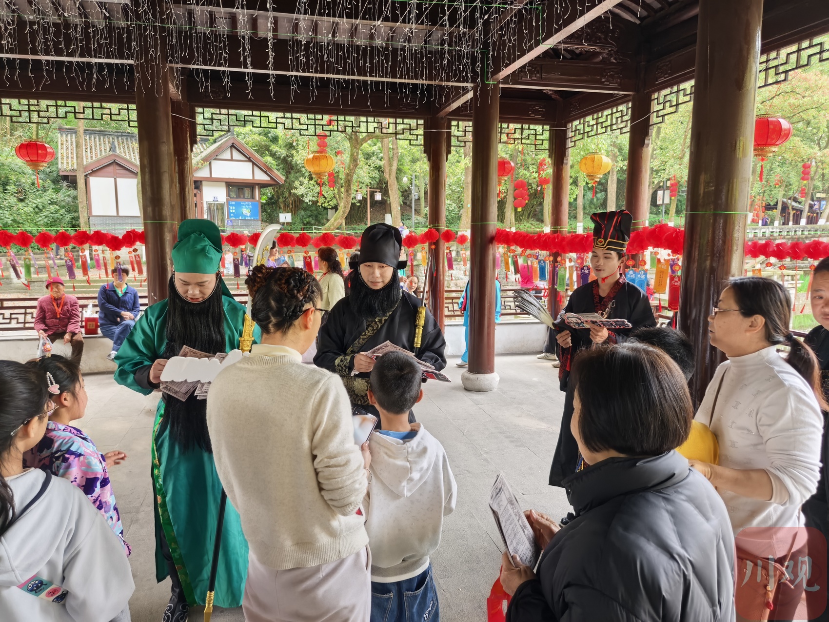 市民游客们围着“诸葛亮”“张飞”“关羽”互动。