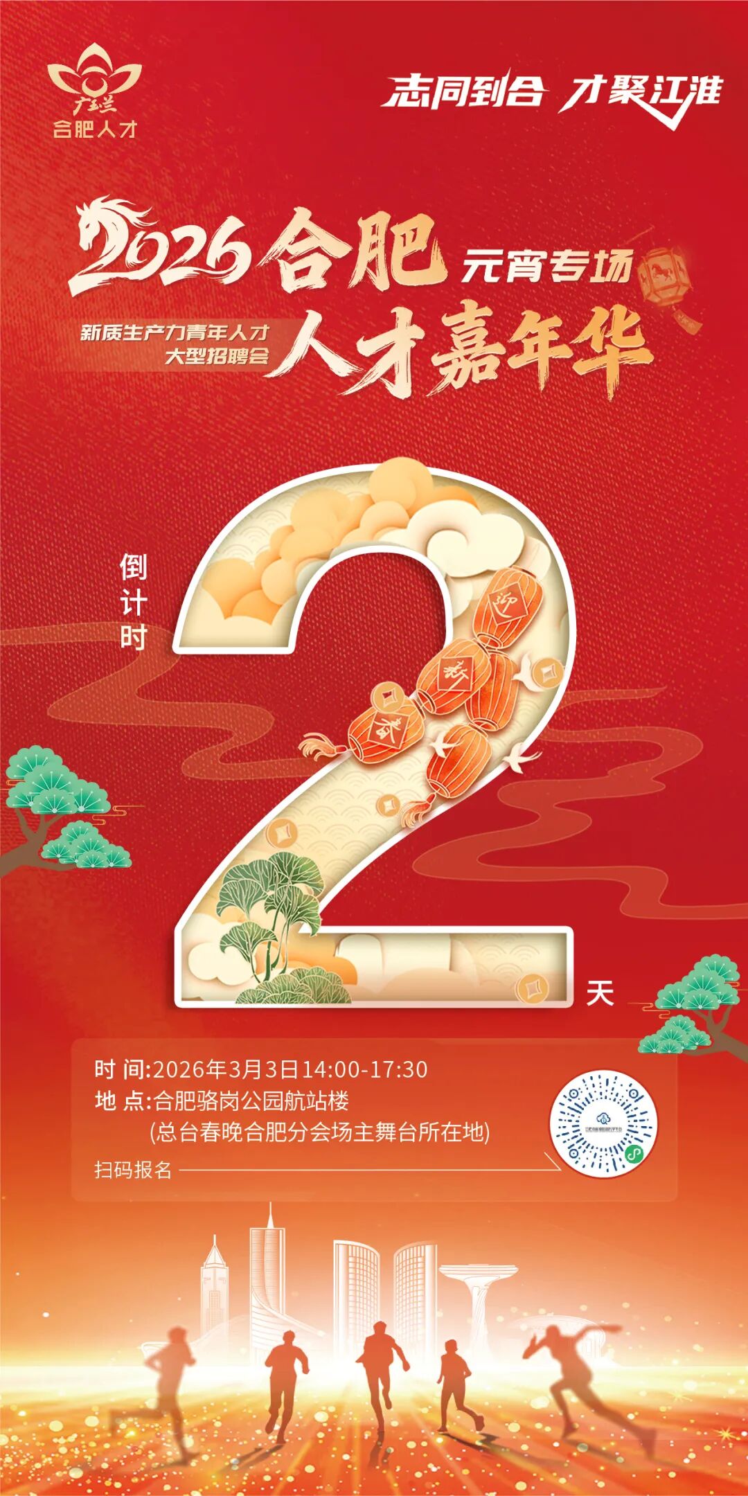 3月3日下午2时,“志同到合 才聚江淮”2026年“合肥人才嘉年华”——新质生产力青年人才大型招聘会(元宵专场),将在骆岗公园航站楼启幕。