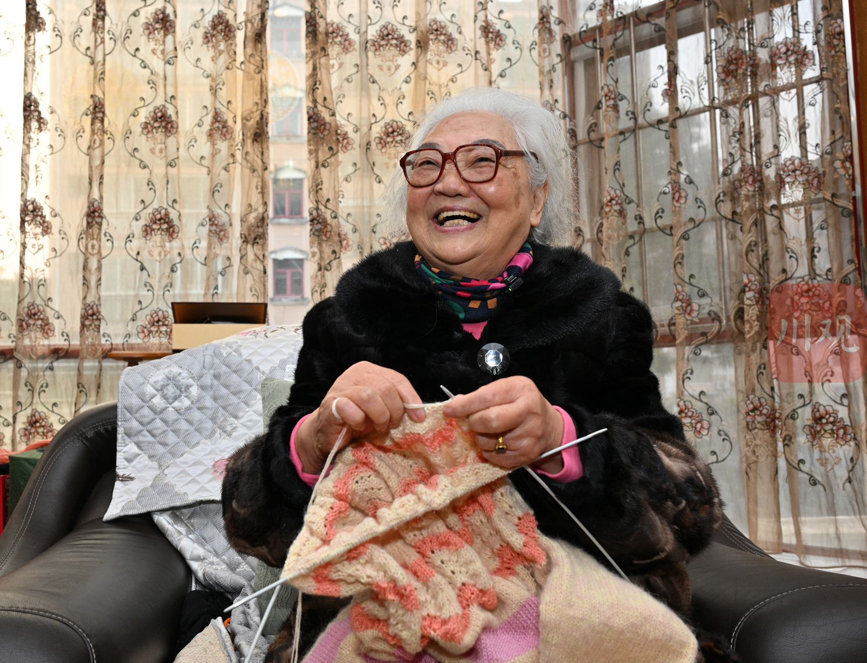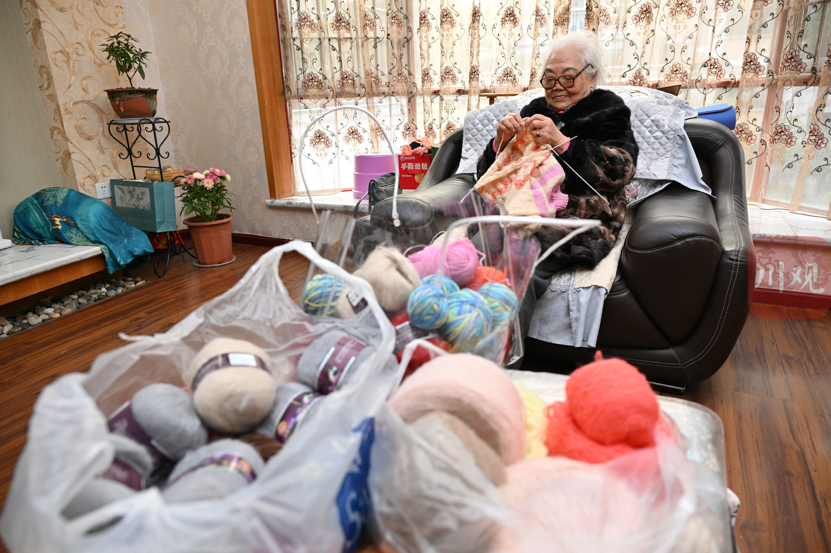 袁桂珍婆婆在家里织毛衣,一针一线都是慢慢的善意。