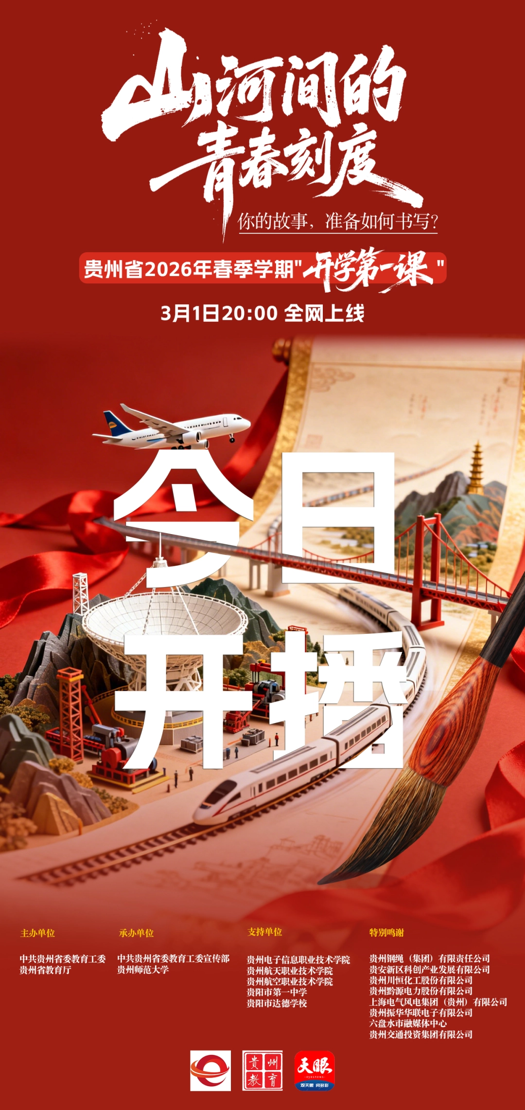 3月1日晚8点,由中共贵州省委教育工委、贵州省教育厅精心策划的贵州省2026年春季学期“开学第一课”——《山河间的青春刻度》正式开播。