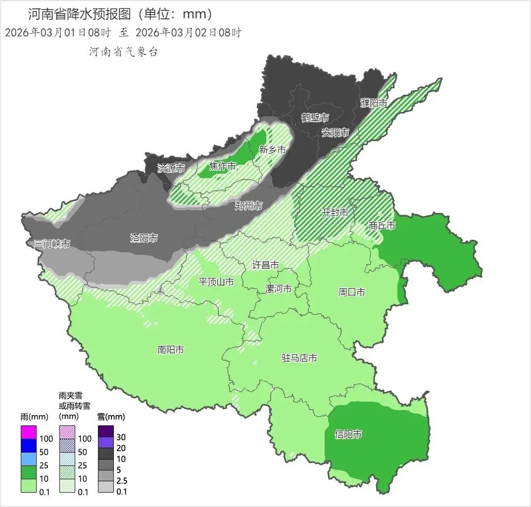 今天下午到夜里,全省阴天,黄河以北和三门峡、洛阳、郑州、开封、商丘西部、许昌北部、平顶山西部、南阳北部有雨夹雪或小到中雪,部分县(市、区)大到暴雪;其他县(市、区)有小到中雨。全省偏北风3到4级,阵风6级左右。