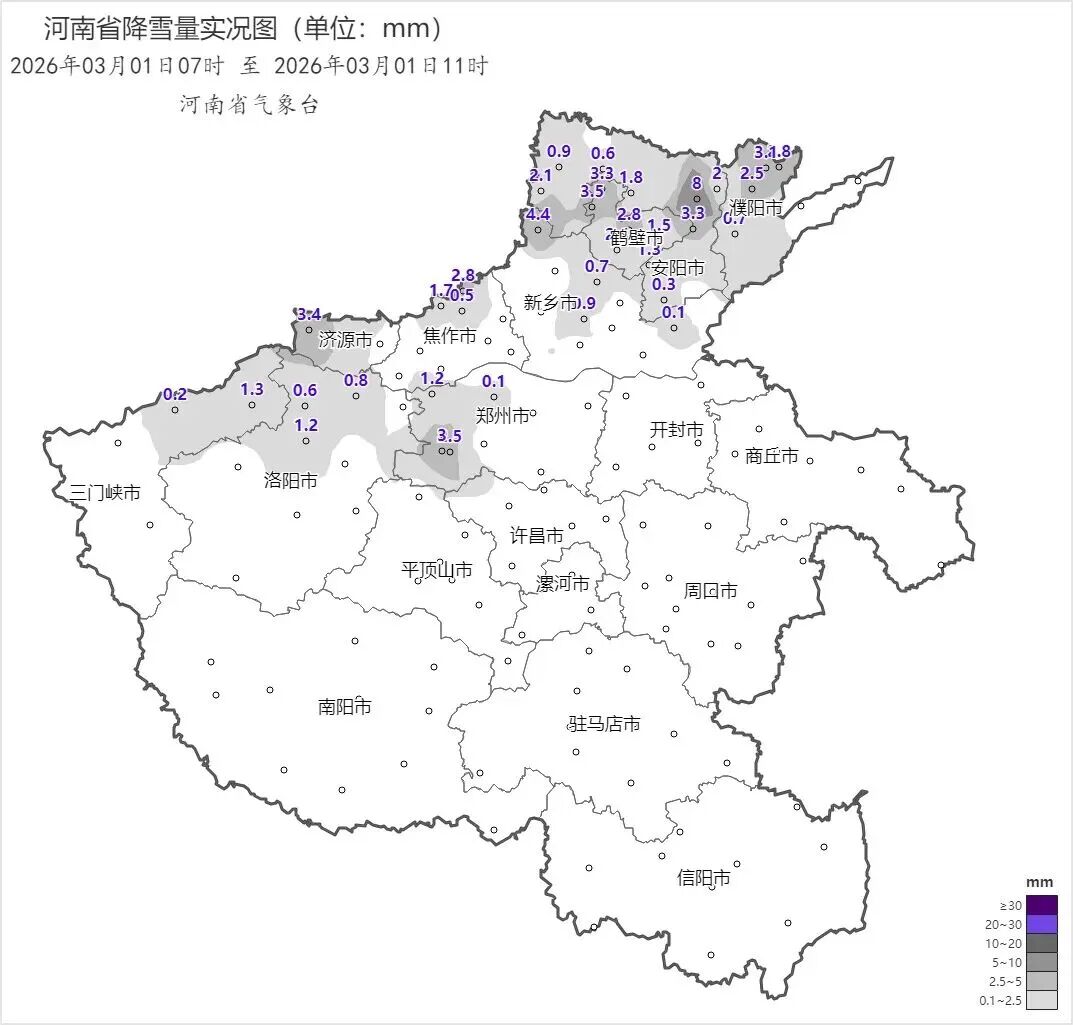 昨天全省出现小到中雨,北部、中西部出现中到大雪局部暴雪(详情)。截至1日5时,我省北部安阳、鹤壁等地部分县(市、区)有1到4厘米积雪。