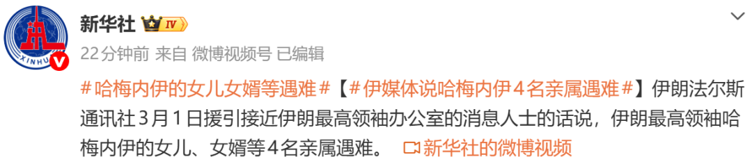 另据新华社消息,伊朗法尔斯通讯社3月1日援引接近伊朗最高领袖办公室的消息人士的话说,伊朗最高领袖哈梅内伊的女儿、女婿等4名亲属遇难。