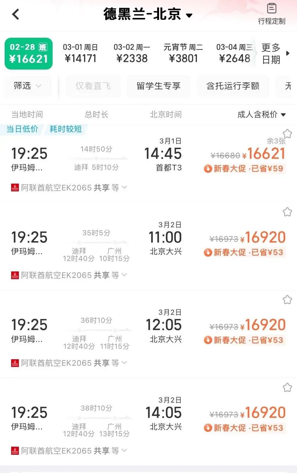 据同程旅行数据显示,2月28日,从伊朗德黑兰飞往北京的机票最低已超过1.6万元,最高达2.1万元;同一天从德黑兰返回上海的航班已无直飞选项,最低票价达4.4万元;而从德黑兰返回广州的公务舱最高票价也接近5万元。
