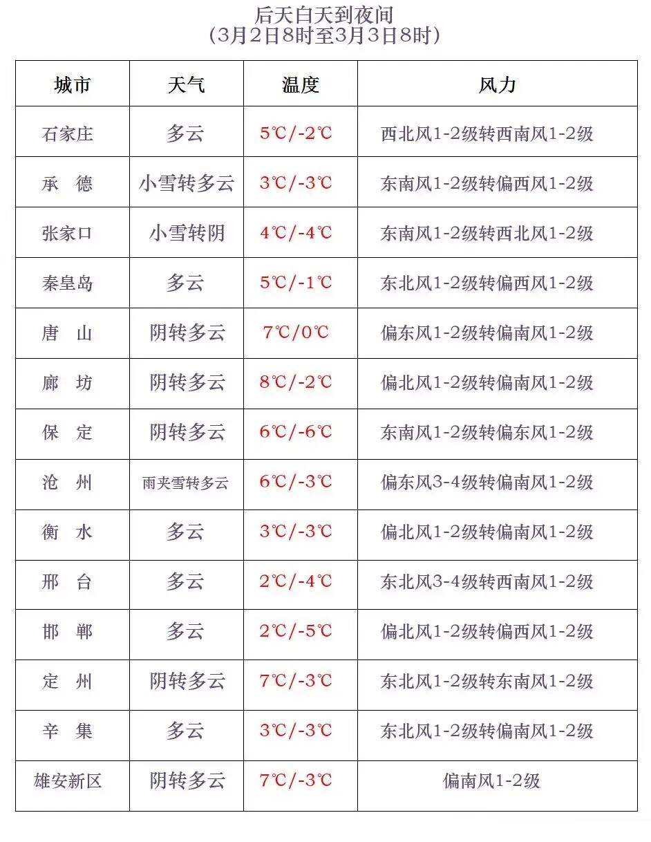 明天夜间到3月2日,保定、廊坊及以南地区阴有小雪或雨夹雪转多云,其中石家庄、衡水、邢台、邯郸有中到大雪,部分地区有暴雪,其他地区多云转阴有小雪或零星小雪。