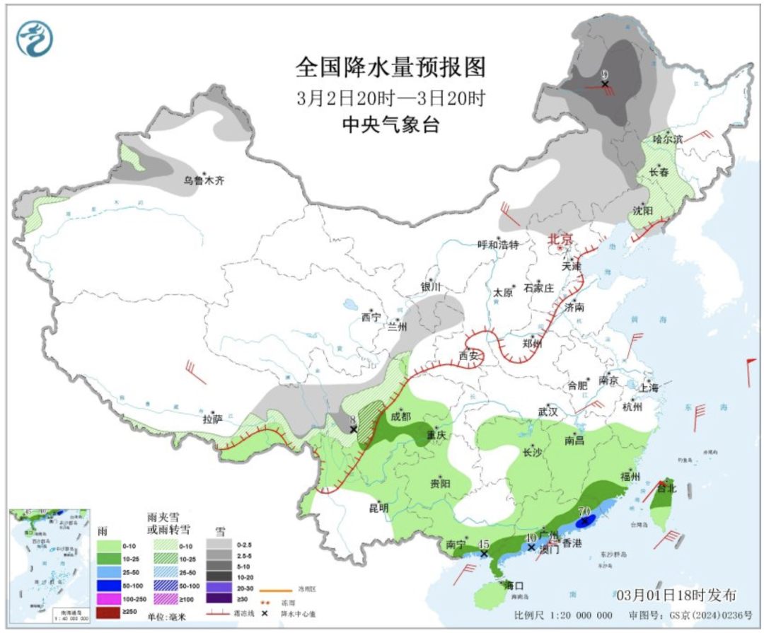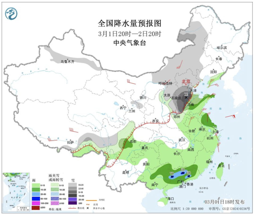 今明两天(3月1日至2日),我国雨雪范围较大,北方多地将现较强降雪,江南、华南降雨频繁。受雨雪和冷空气影响,北方多地未来几天最高气温将持续偏低,华北等地体感阴冷,需注意保暖。