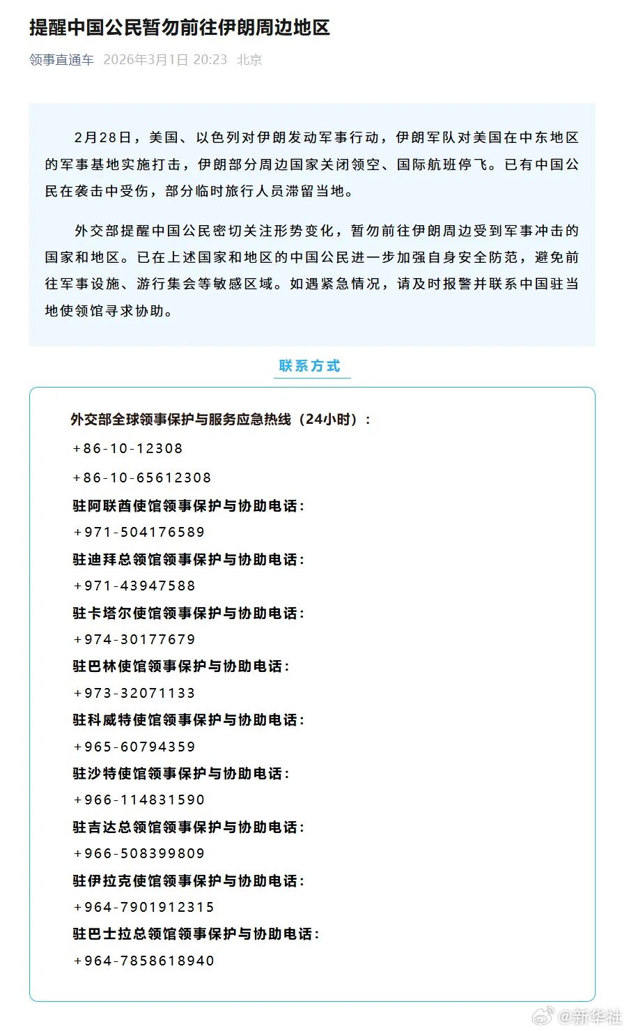 外交部提醒中国公民密切关注形势变化,暂勿前往伊朗周边受到军事冲击的国家和地区。已在上述国家和地区的中国公民进一步加强自身安全防范,避免前往军事设施、游行集会等敏感区域。如遇紧急情况,请及时报警并联系中国驻当地使领馆寻求协助。