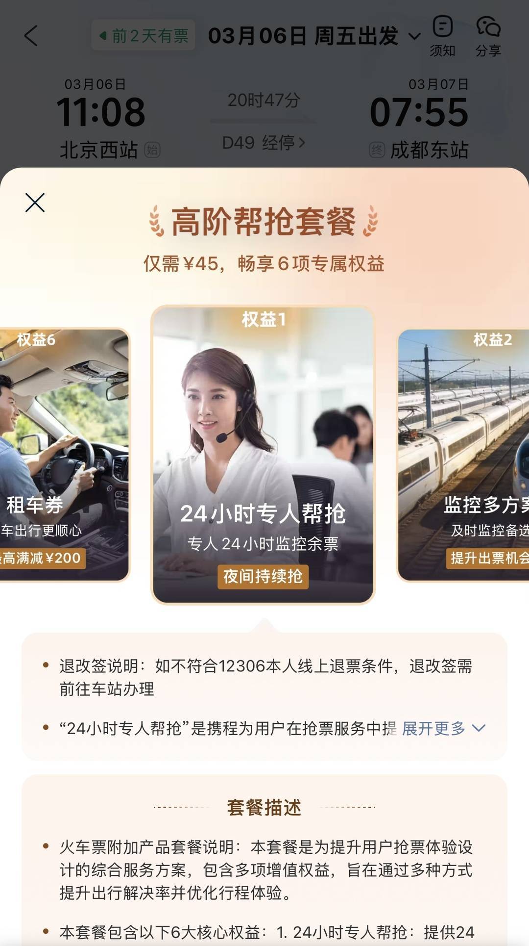 携程的“高阶帮抢套餐”仍以“24小时专人帮抢”为核心卖点。网络截图