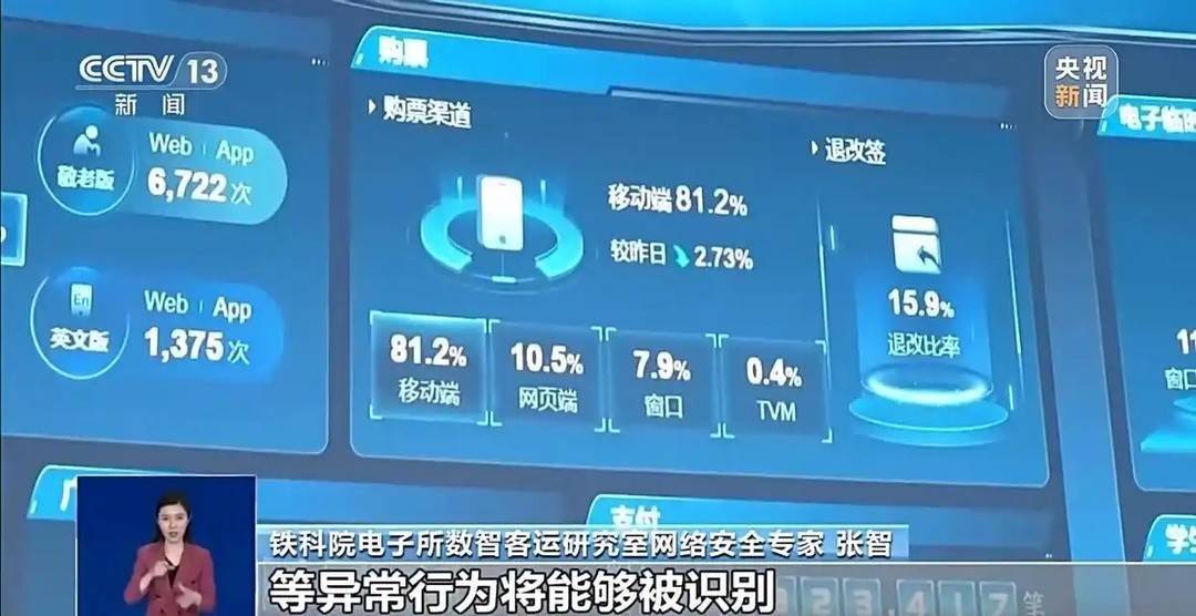 铁科院电子所数智客运研究室网络安全专家张智称,绝大多数“抢票软件”的高频刷票等异常行为将能被识别。图片来源:央视