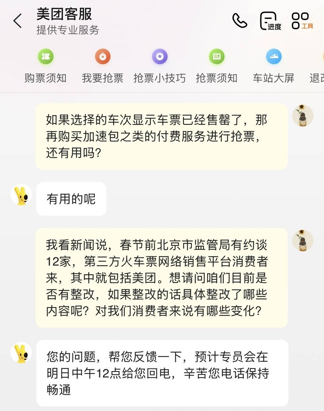 美团客服称火车票售罄后再购买加速包等付费服务依然有用。网络截图