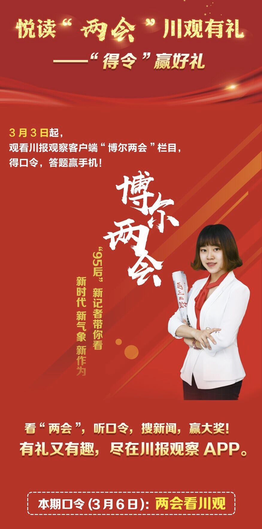 “两会”期间,观看川报观察客户端推出的“博尔两会”系列节目(见文末链接),获取主持人的提问和口令进行答题,即有机会获得大奖!