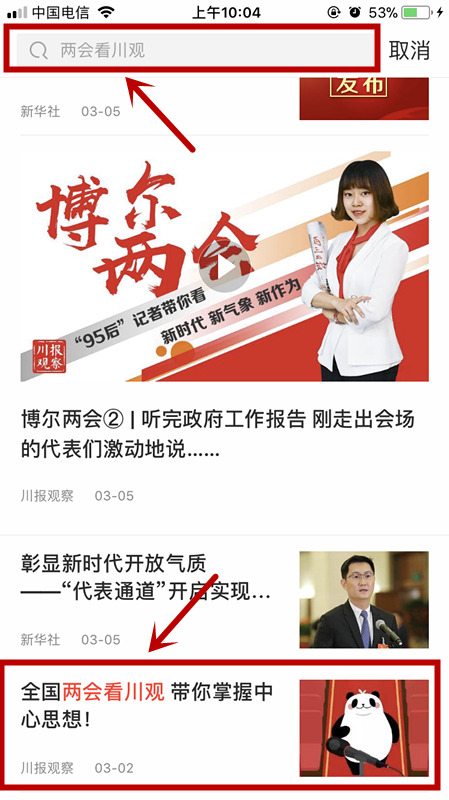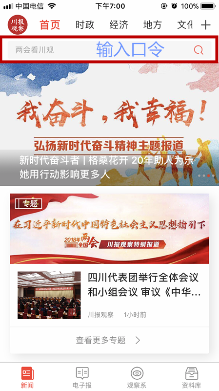 1、关注川报观察客户端推出的“博尔两会”系列节目,得到主持人提出的问题以及寻找问题的口令后,在川报观察客户端首页搜索框中输入口令;(例如主持人在节目中提问:“川报观察携手四川省人大、四川省政协推出的互动报道叫什么名字?”,公布寻找答案的口令为:“两会看川观”)