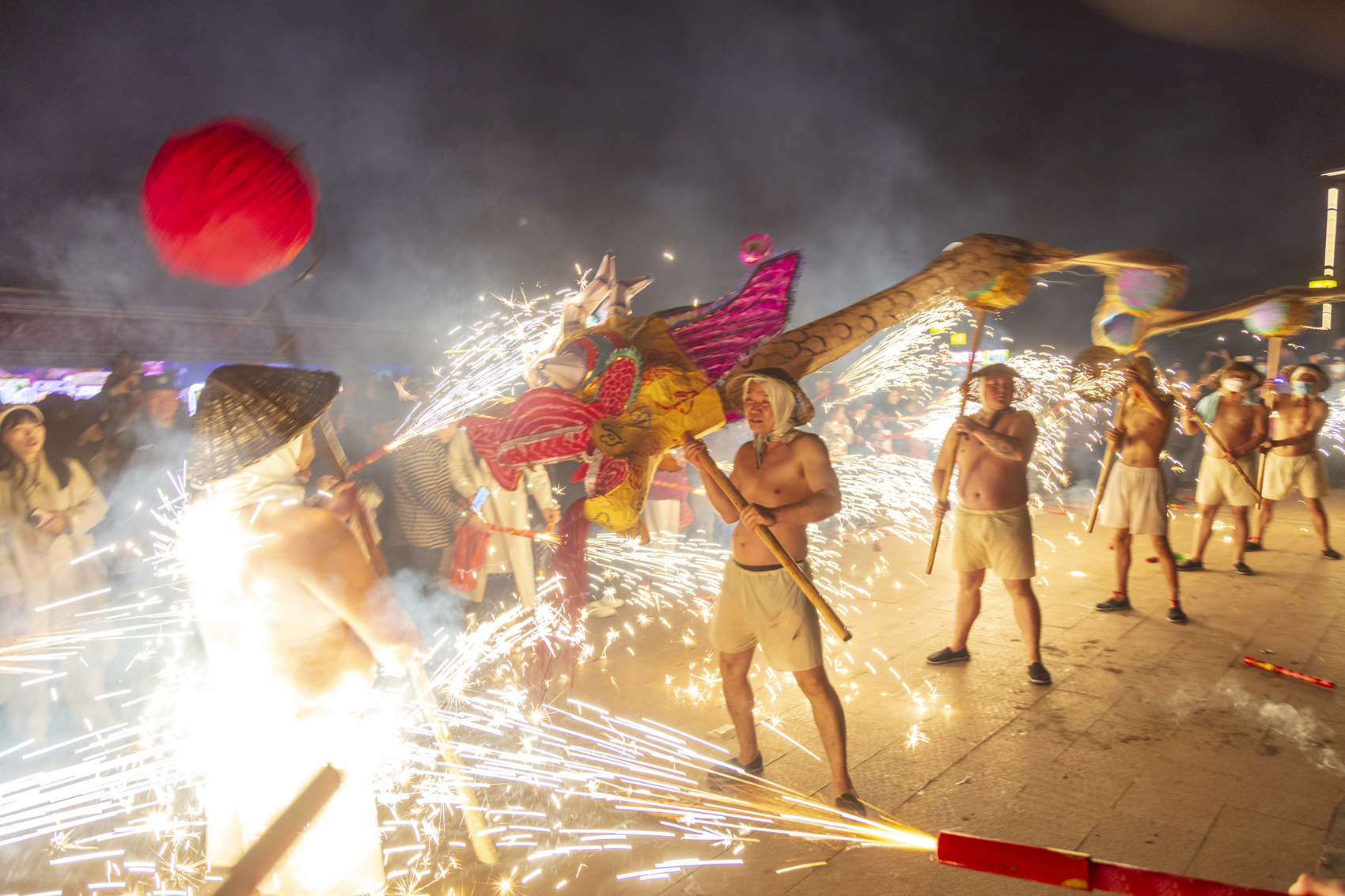 烧火龙,是省级非物质文化遗产代表性项目。石桥镇,是国家级历史文化名镇。当晚,来自古镇各街道的五条火龙依次出发,沿街巡游、请水、拜年、展演,街面锣鼓喧天、龙影翻飞,所到之处欢呼声此起彼伏。夜幕之下,火龙腾跃穿梭,街巷人头攒动,烟火气与年味儿交织,场面热闹非凡。