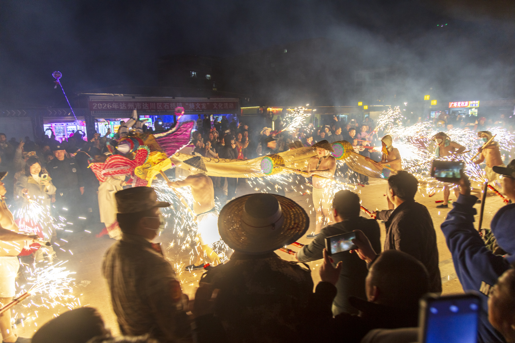 3月1日正月十三,夜幕降临时,达州市达川区石桥镇场镇灯火璀璨、人声鼎沸,人们共赏“烧火龙”民俗盛宴。