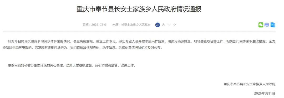 通报称,针对今日网民反映我乡溶洞水体异常的情况,县里高度重视,成立工作专班,派出专业人员开展水质采样监测、周边污染源排查、现场勘查取证等工作,相关部门同步采取整改措施,全力控制对生态环境影响。若发现有违规违法行为,我们将依法依规查处,绝不姑息。后续处置情况我们将及时公布。