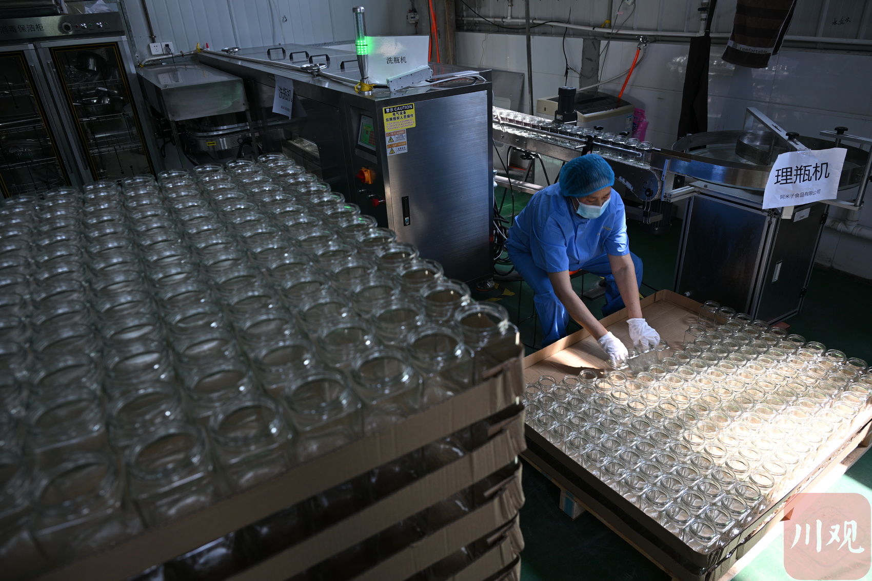 技术人员在生产线上放瓶。