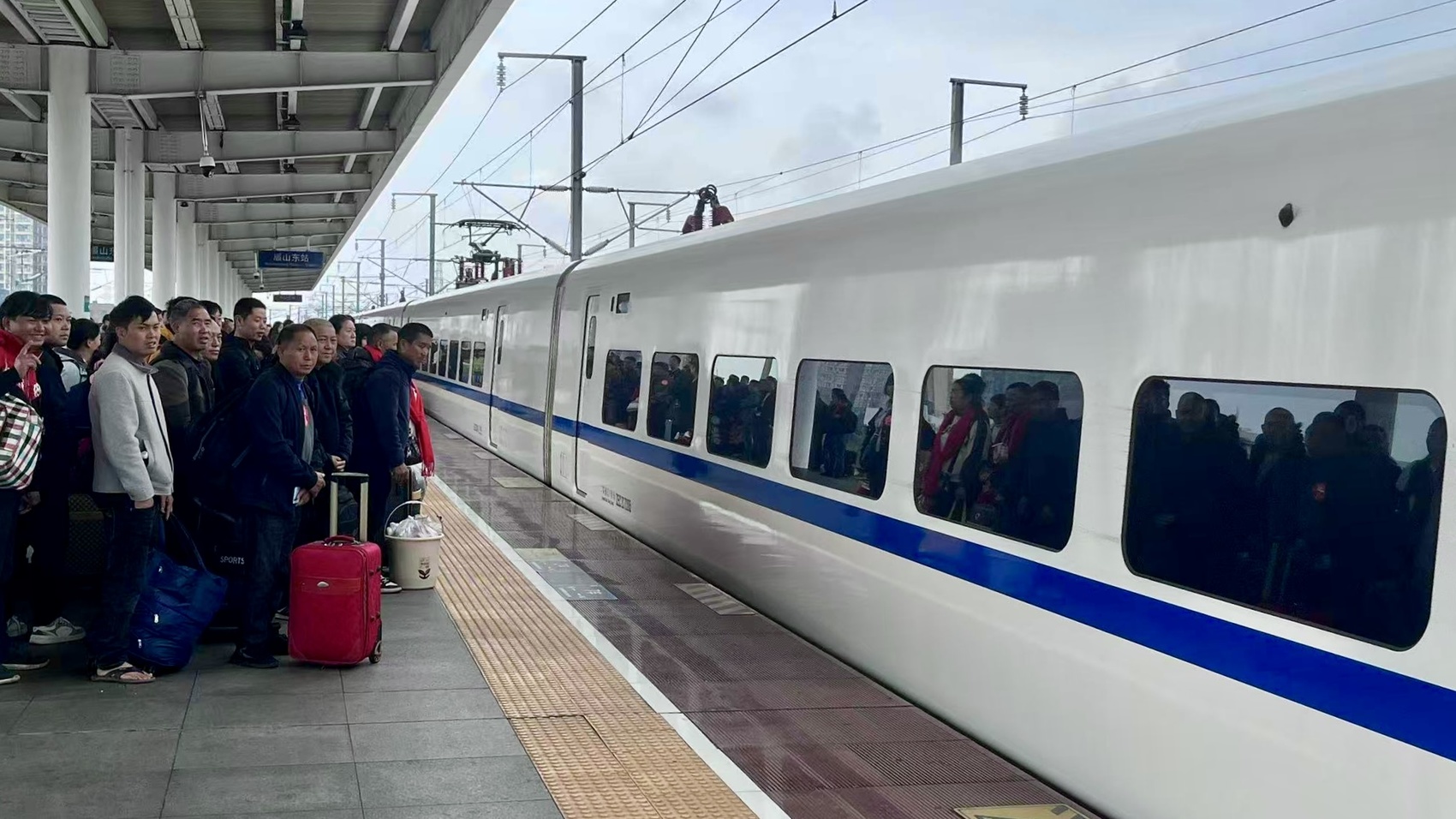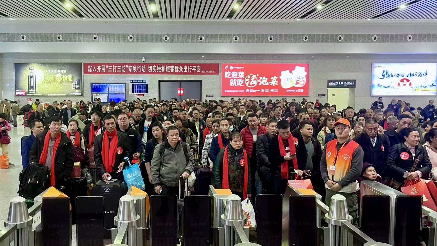 3月2日,正值农历正月返岗复工高峰期。当天上午9点半,340名来自东坡区、彭山区、仁寿县、丹棱县等各区县的眉山籍外出务工人员,戴着红围巾,提着行李和家乡特产陆续通过眉山东站绿色通道进站候车、检票登车。