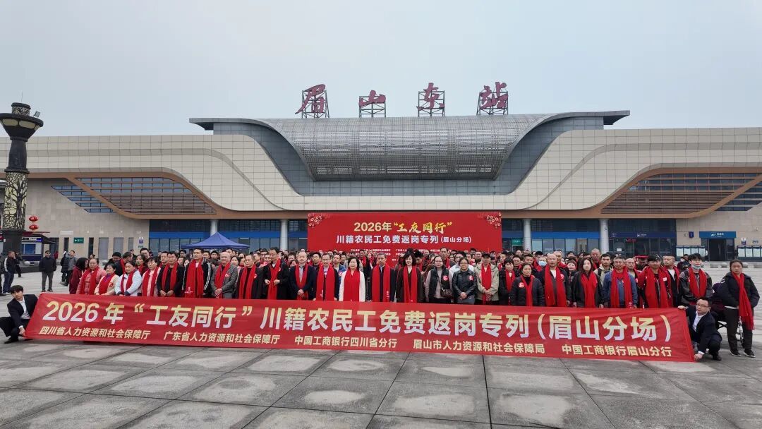 临行前,眉山市人力资源和社会保障局举办了2026年“工友同行”川籍农民工免费返岗专列(眉山分场)送站仪式,现场为眉山籍农民工派发了爱心伴手礼,包含水杯、雨伞、围巾和午餐券等物品,希望给外出务工的家人提供家乡的温暖。