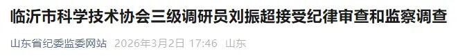 据临沂市纪委监委消息:临沂市科学技术协会三级调研员刘振超涉嫌严重违纪违法,目前正接受临沂市纪委监委纪律审查和监察调查。