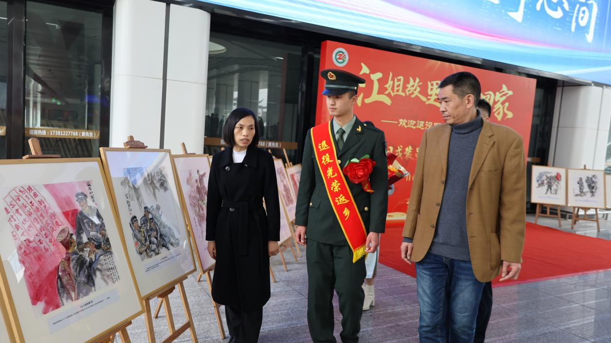 当日上午,“德行兼备 铭记使命”卢德铭故事主题画展在出站口两侧进行展示,共展出画作40幅。现场,自流井区委党校讲师为刚返乡的退役士兵讲授党课,介绍秋收起义总指挥卢德铭的生平事迹,为刚返乡的退役士兵讲2026年第一堂“月台思政课”。