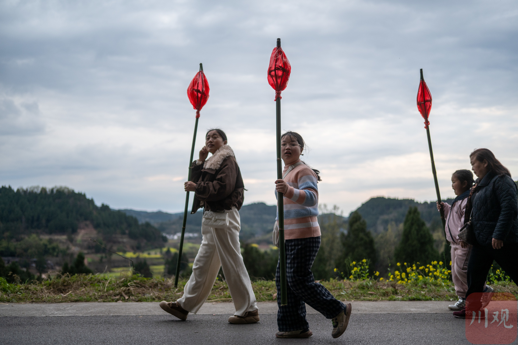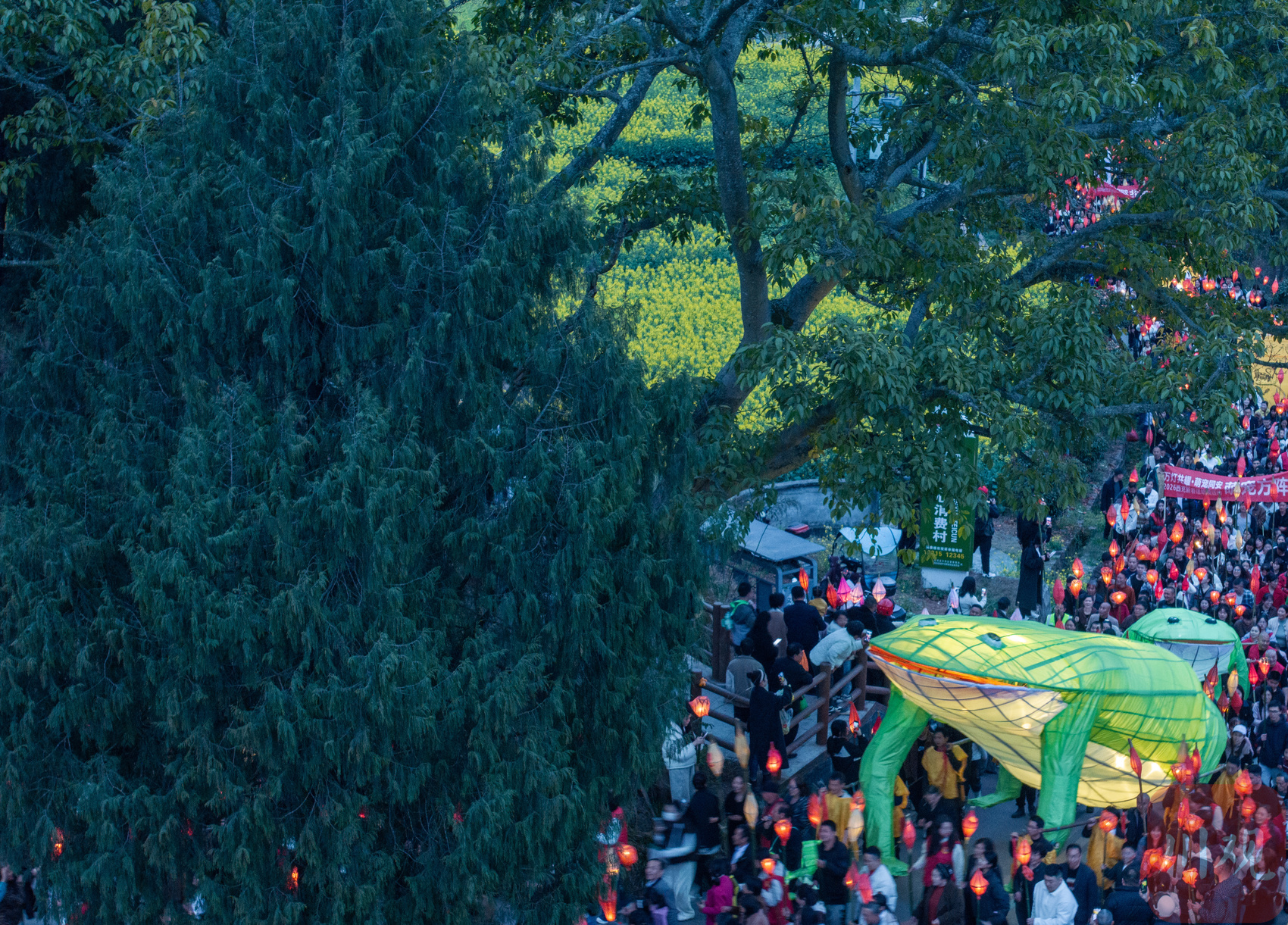 活动现场,村民手工制作的巨型蛴蟆灯格外醒目:灯具高4米、长8米、重达300斤。村民与游客手持点亮的红色蛴蟆灯,簇拥巨型灯组沿乡间道路前行,完成3公里徒步祈福。点点红灯汇成绵延灯龙,传统民谣相伴而行,现场群众以民俗仪式寄托驱邪避灾、平安健康、风调雨顺的美好心愿。