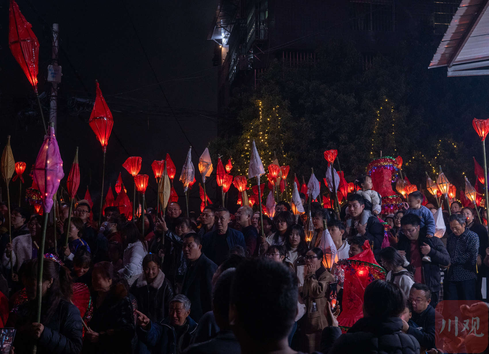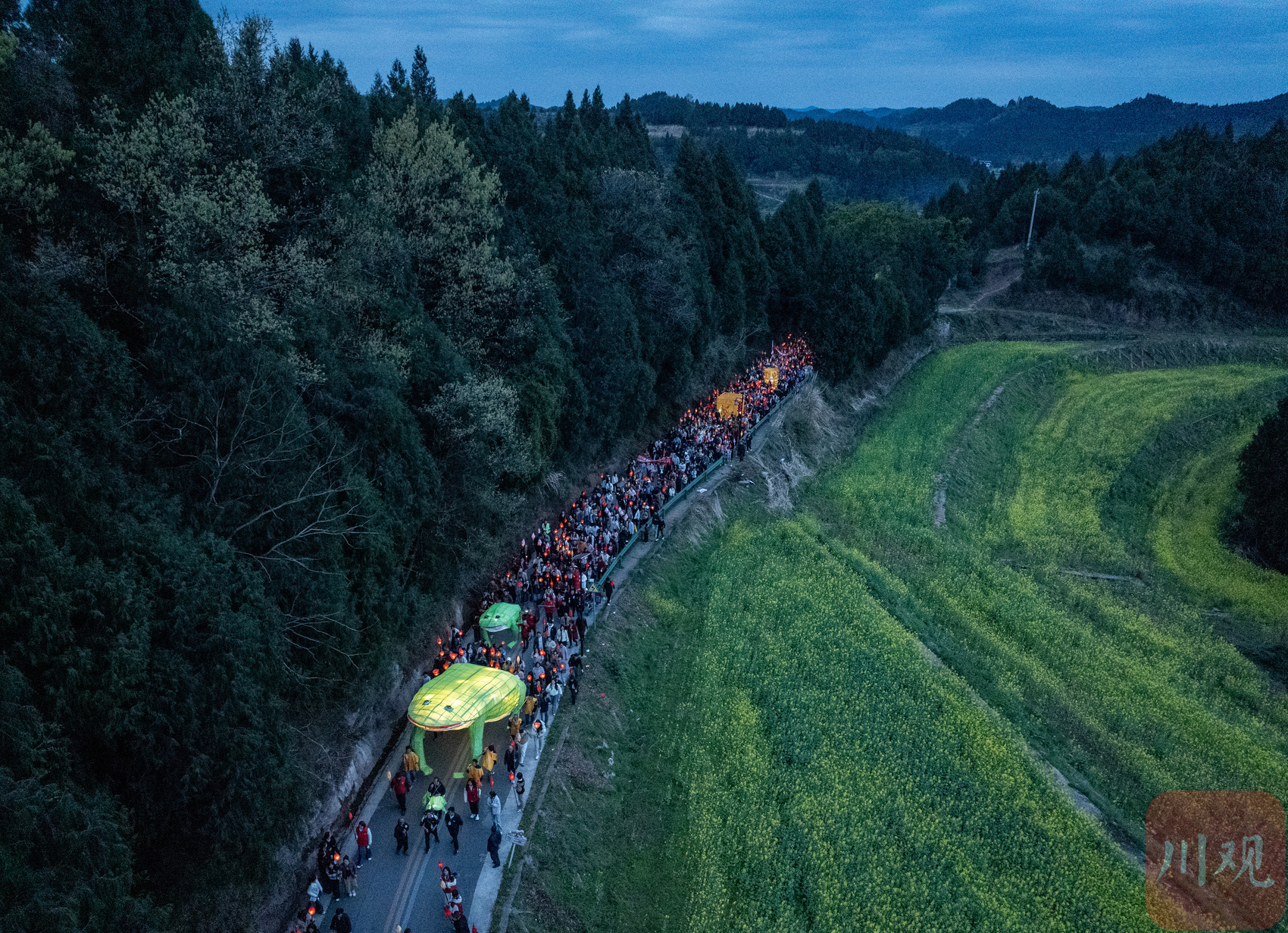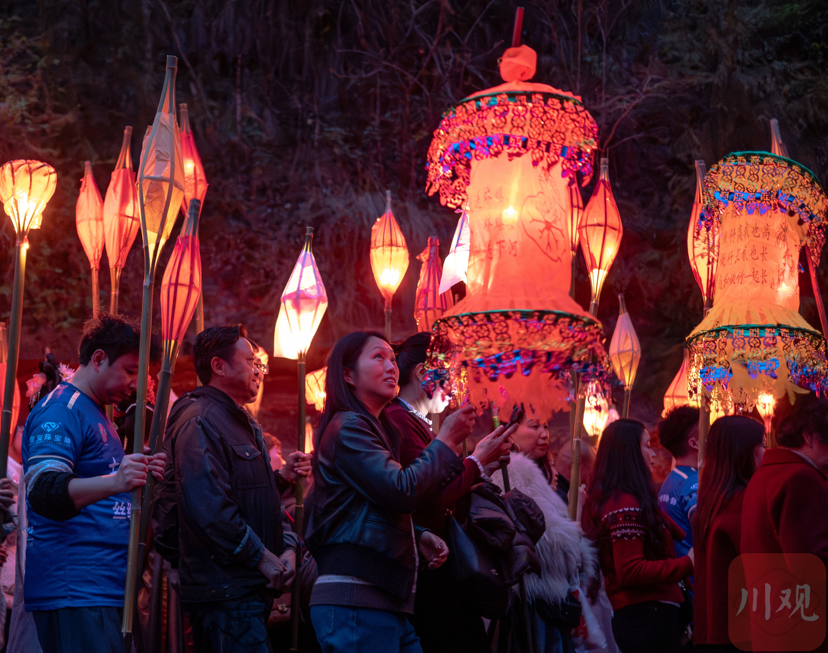 村民和游客手持蛴蟆灯进行送蛴蟆活动。