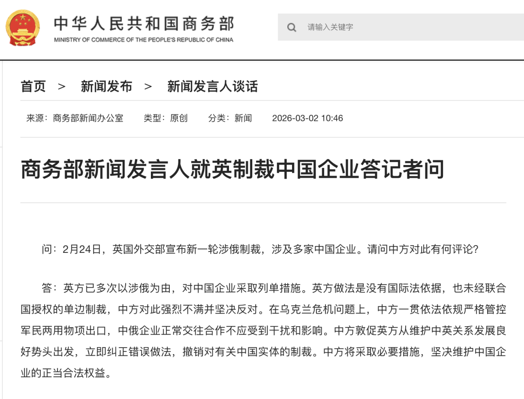 3月2日,商务部新闻发言人就英制裁中国企业答记者问。