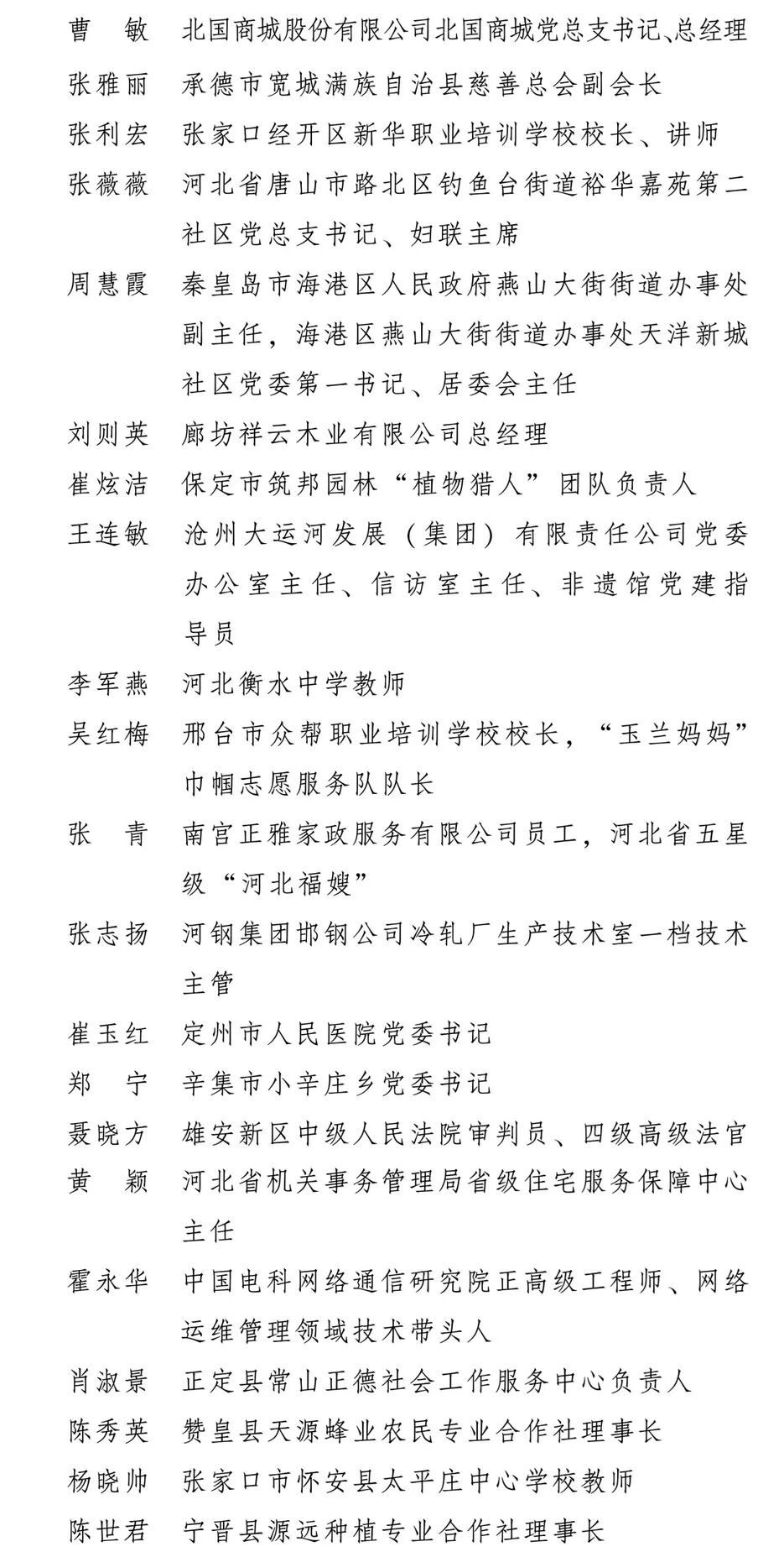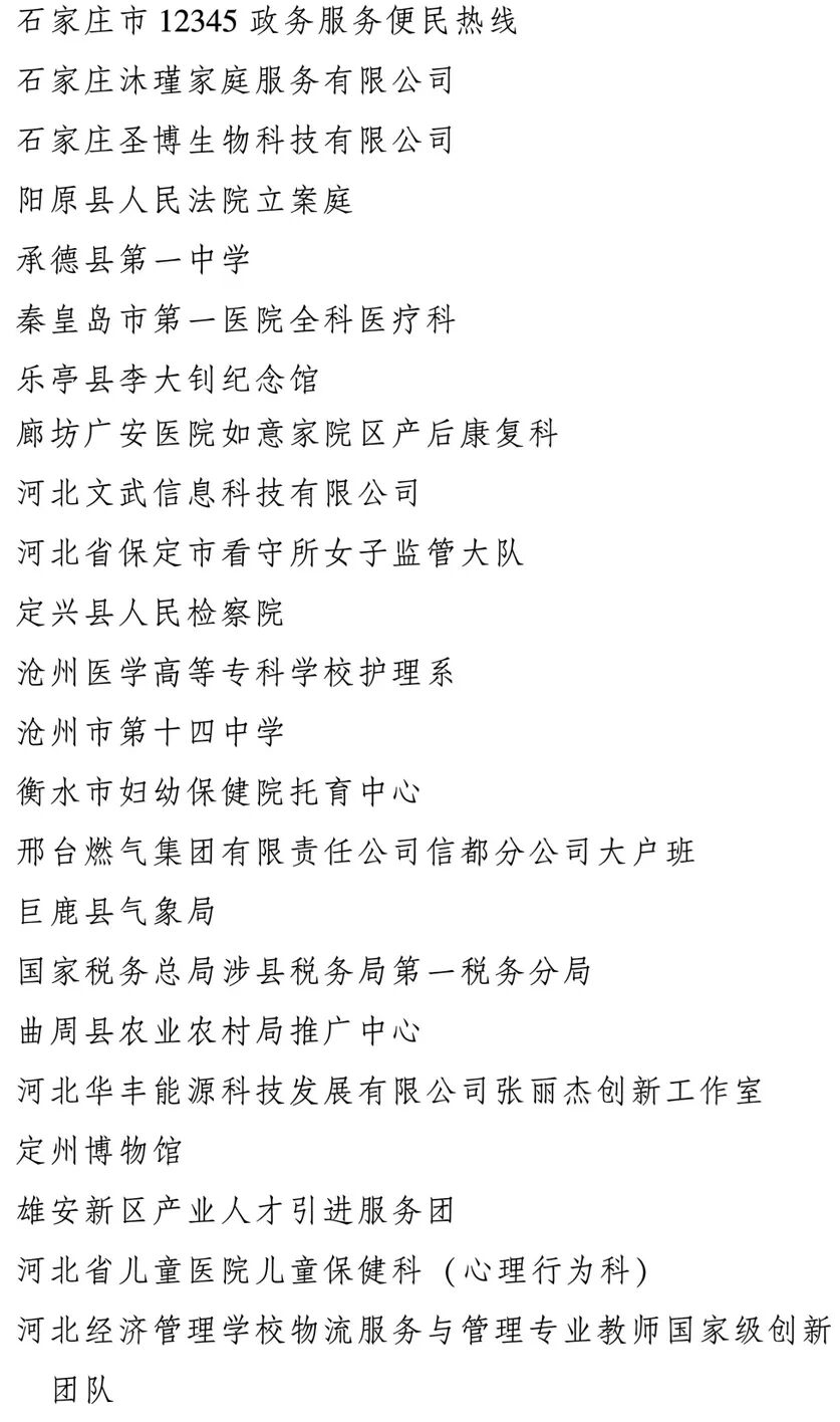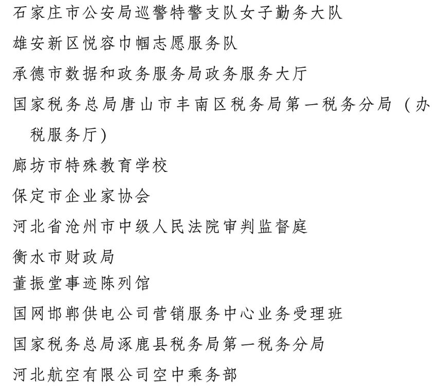 今天,全国妇联在北京举行纪念“三八”国际妇女节暨表彰大会。大会表彰了9名全国三八红旗手标兵、598名全国三八红旗手、400个全国三八红旗集体、600个全国巾帼文明岗。其中,河北21名全国三八红旗手、12个全国三八红旗集体、23个全国巾帼文明岗入选名单。