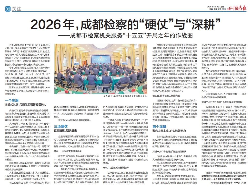 如果说三场硬仗是今年必须攻克的短板,那么这两个深耕方向就是成都检察在长期实践中沉淀下来的特色打法。2026年,成都检察要继续深化、持续打磨。