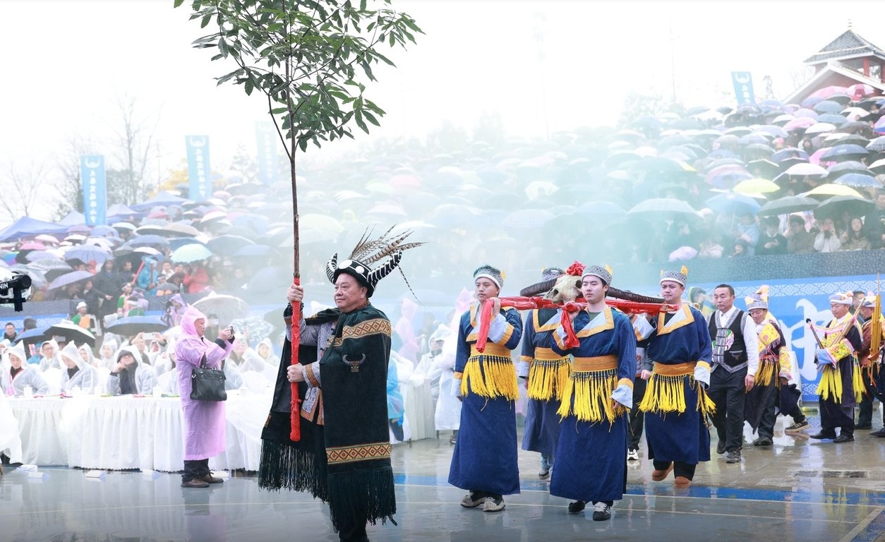 “每年踩山节前,乡里德高望重的苗族长者会带领年轻力壮的男子到山上挑选一棵挺直高大的杉树作为花杆,通常树高约 7.5 米,要求树干通直、枝叶繁茂。”古蔺县大寨苗族乡党委副书记、乡长杨雷说。