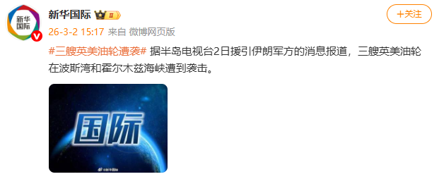 3月2日,据新华国际报道,半岛电视台2日援引伊朗军方的消息报道,三艘英美油轮在波斯湾和霍尔木兹海峡遭到袭击。